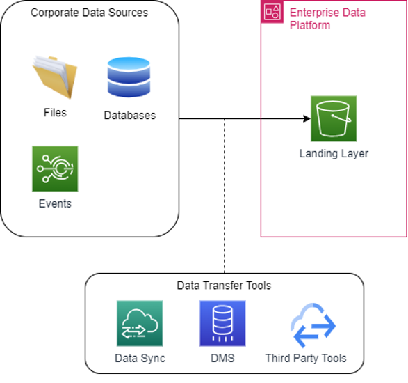Regardless of tooling, network connectivity from your corporate network to the AWS account where your enterprise data solution exists is a prerequisite for data transfer. This strategy should be determined with your IT/networking group and based on the amount of data transfer expected, as well as other considerations such as transmission of data over the public internet within corporate policy even when encrypted.