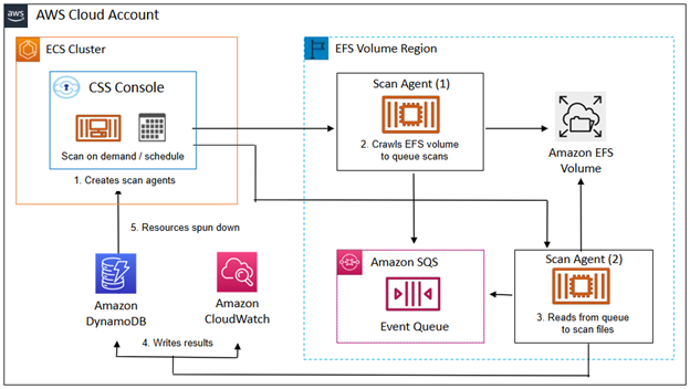 CSS uses an architecture employing core AWS services to facilitate scanning and reporting. The CSS solution discovers EFS file systems, allowing you to quickly identify which ones to protect. You can configure CSS for various malware scenarios, such as on-demand or scheduled scanning, to best align with your organizational needs.
