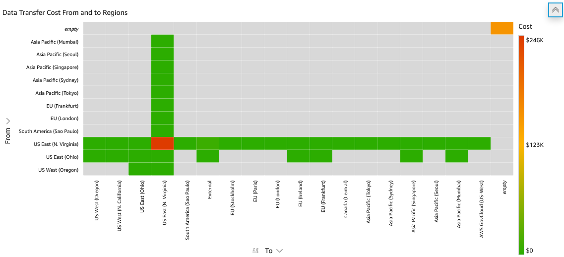 3. Data Transfer Cost From and To Regions You can use this visual to identify the top source and destination regions of the data transfer costs. The top data transfer charges between AWS regions, between Availability Zones, to the Internet (External), or NAT Gateway data transfer costs are highlighted by the colors in the heat map. In the example below, the highest data transfer cost (close to $240K), in red, is from “US East (N. Virginia)” region to “US East (N. Virginia)” region. This will be data transfer cost between Availability Zones in the same region. The 2nd highest data transfer cost (close to $120K), in orange, is between “empty” and “empty”. This will be the data transfer costs for NAT Gateway, which are not between regions.