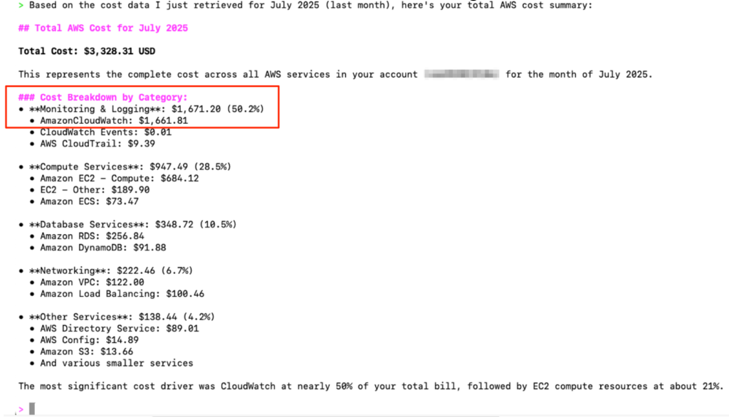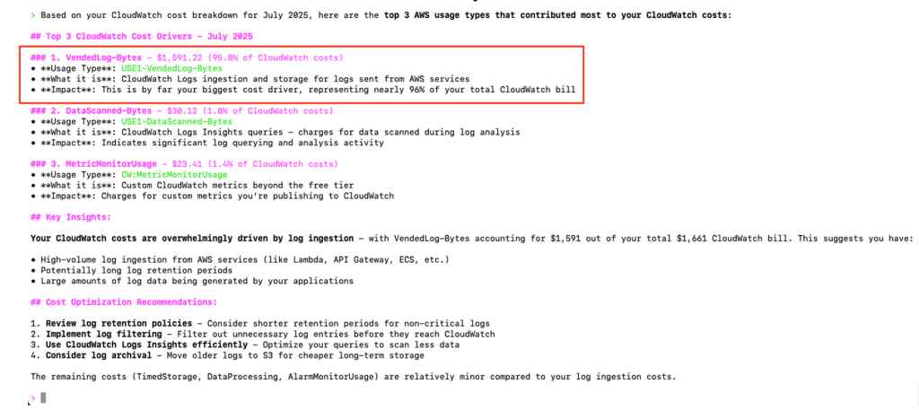 Amazon Q CLI with MCP servers simplifies CloudWatch cost analysis. Using natural language prompts, you can identify cost drivers and receive optimization recommendations for your resources. This streamlined approach minimizes manual exploration, enhances financial control, and improves cloud efficiency.