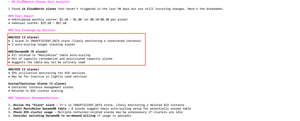 “Show me CloudWatch alarms that haven’t triggered in 90 days but are still incurring charges”