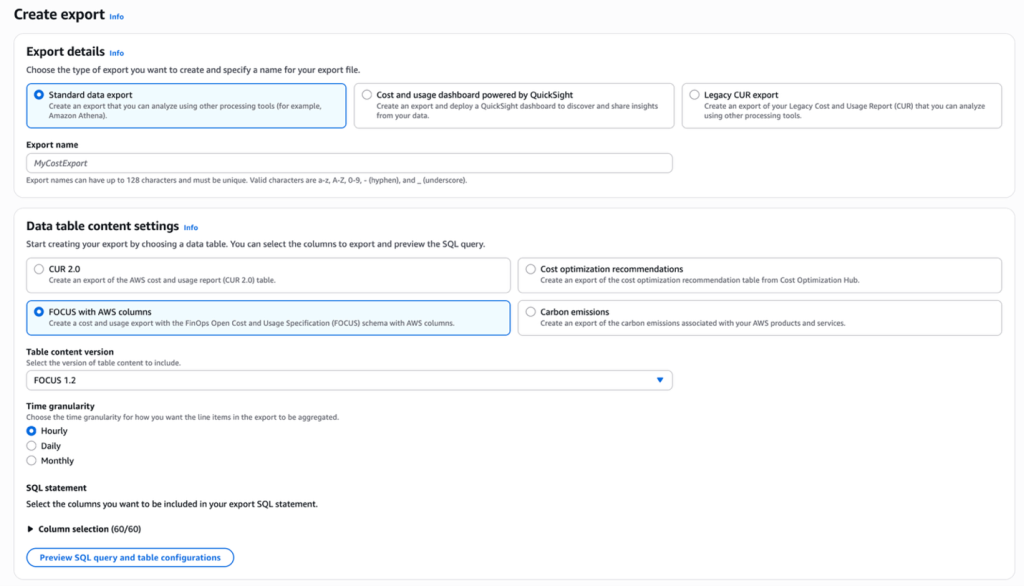 Get started by visiting the AWS Data Exports page in the AWS Billing and Cost Management console and creating an export of the table named “FOCUS with AWS columns” (see Figure 1). A dropdown menu will appear where you can select either FOCUS 1.0 or FOCUS 1.2. Select “FOCUS 1.2” to export FOCUS 1.2 data. Alternatively, you can use the AWS CLI with the bcm-data-exports:CreateExport API to programmatically create FOCUS 1.2 exports.