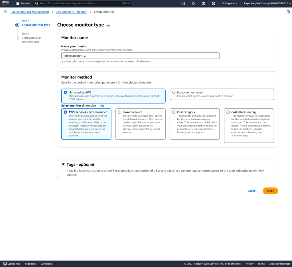 Figure 1 Selecting AWS managed monitor method in the Cost Anomaly Detection console