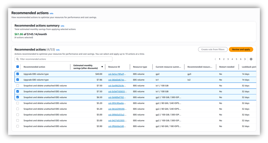 Click any volume ID to review the recommendation in detail. Filter by AWS Regions or resource tags to target specific segments of your fleet that you want to optimize. After reviewing the recommendations, select the actions you want to apply and confirm them on the next page to start implementation (see Figure 1). This hands-on approach is ideal for handling one-time cleanup efforts or learning how the optimization process works where you need to review each action.