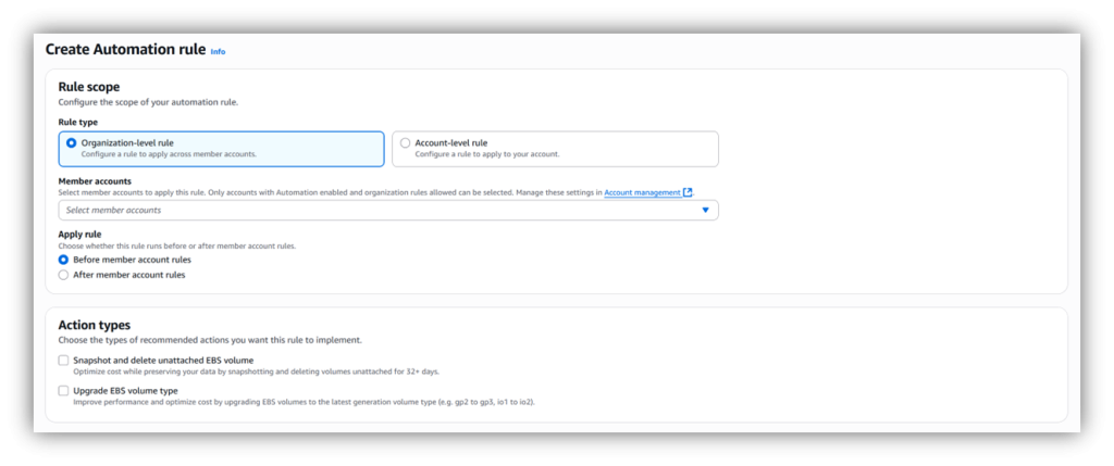 Starting today, AWS Compute Optimizer introduces a new automation feature that streamlines how you optimize Amazon Elastic Block Store (EBS) volumes. Instead of dedicating valuable engineering hours to optimization tasks, you can now create automation rules that continuously clean up unattached volumes and upgrade volume types based on Compute Optimizer’s data-driven recommendations, freeing your teams to focus on what matters most.