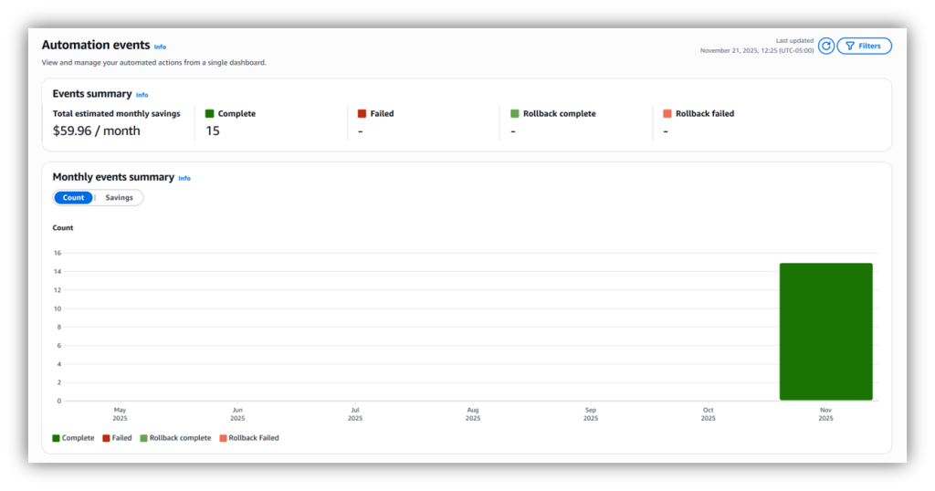 A new dashboard provides visibility into all your automations, summarizing event count and estimated monthly savings by status and month of execution. You can track automation progress over time to help you refine your optimization strategy as needed.