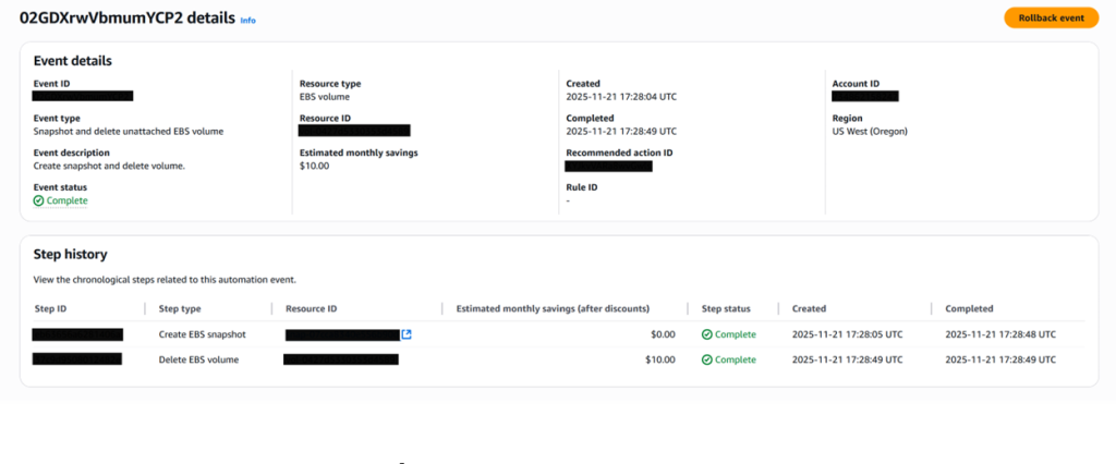 If you need to reverse an action, you can do so from the “Automation events” page. For volume deletions, AWS Compute Optimizer restores data from the created snapshot to a new Amazon EBS volume (with a new volume ID). For volume type upgrades, Compute Optimizer reverses the action by initiating a new volume modification to change the volume type to the previous configuration.