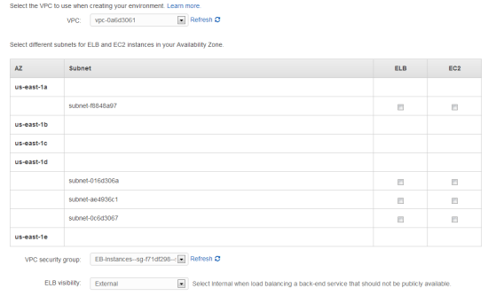 - A VPC configuration page to help secure your environment inside an existing VPC. Be sure to check out the Elastic Beanstalk Developer Guide for the requirements to run your Elastic Beanstalk environment in a VPC.