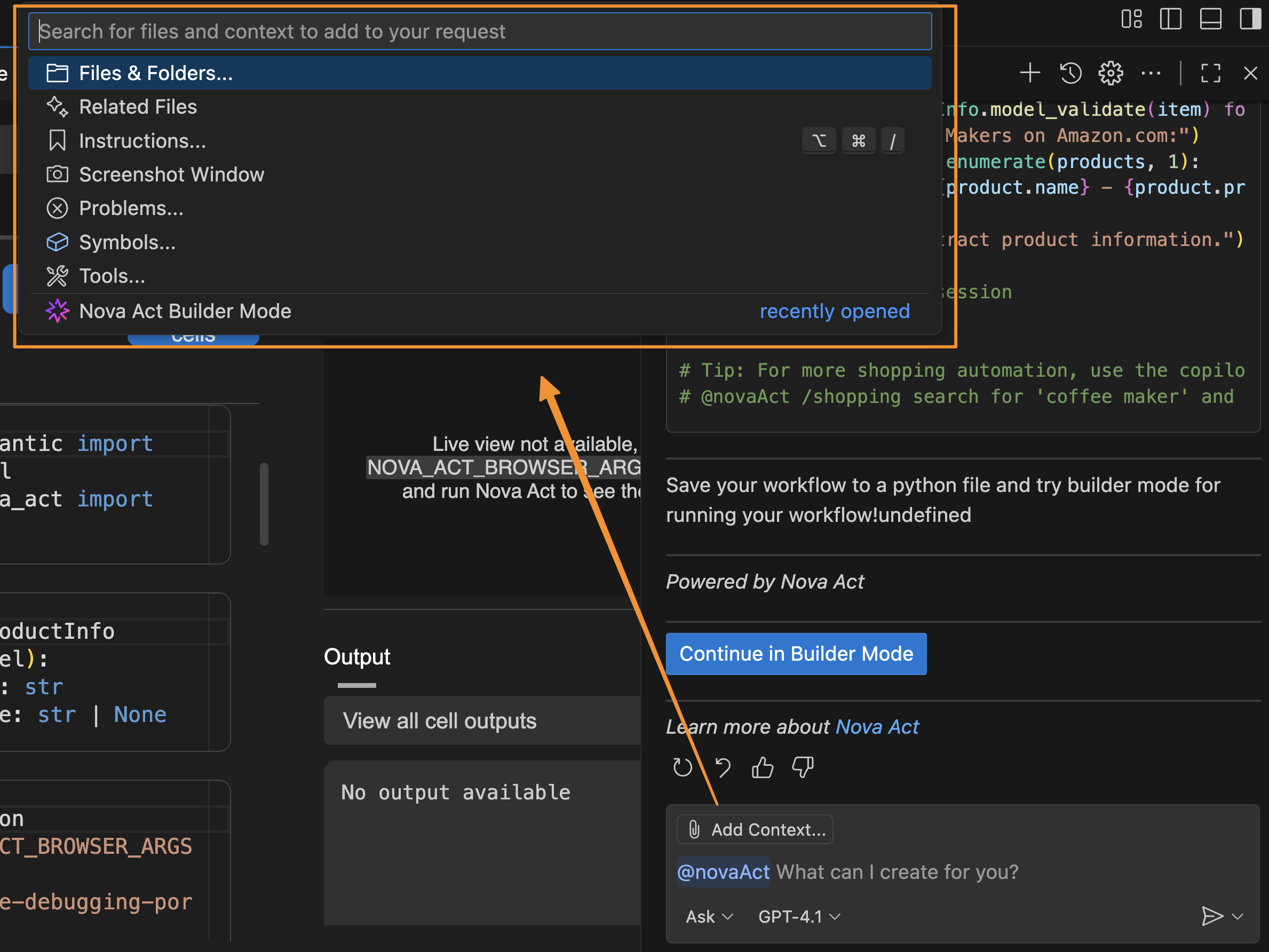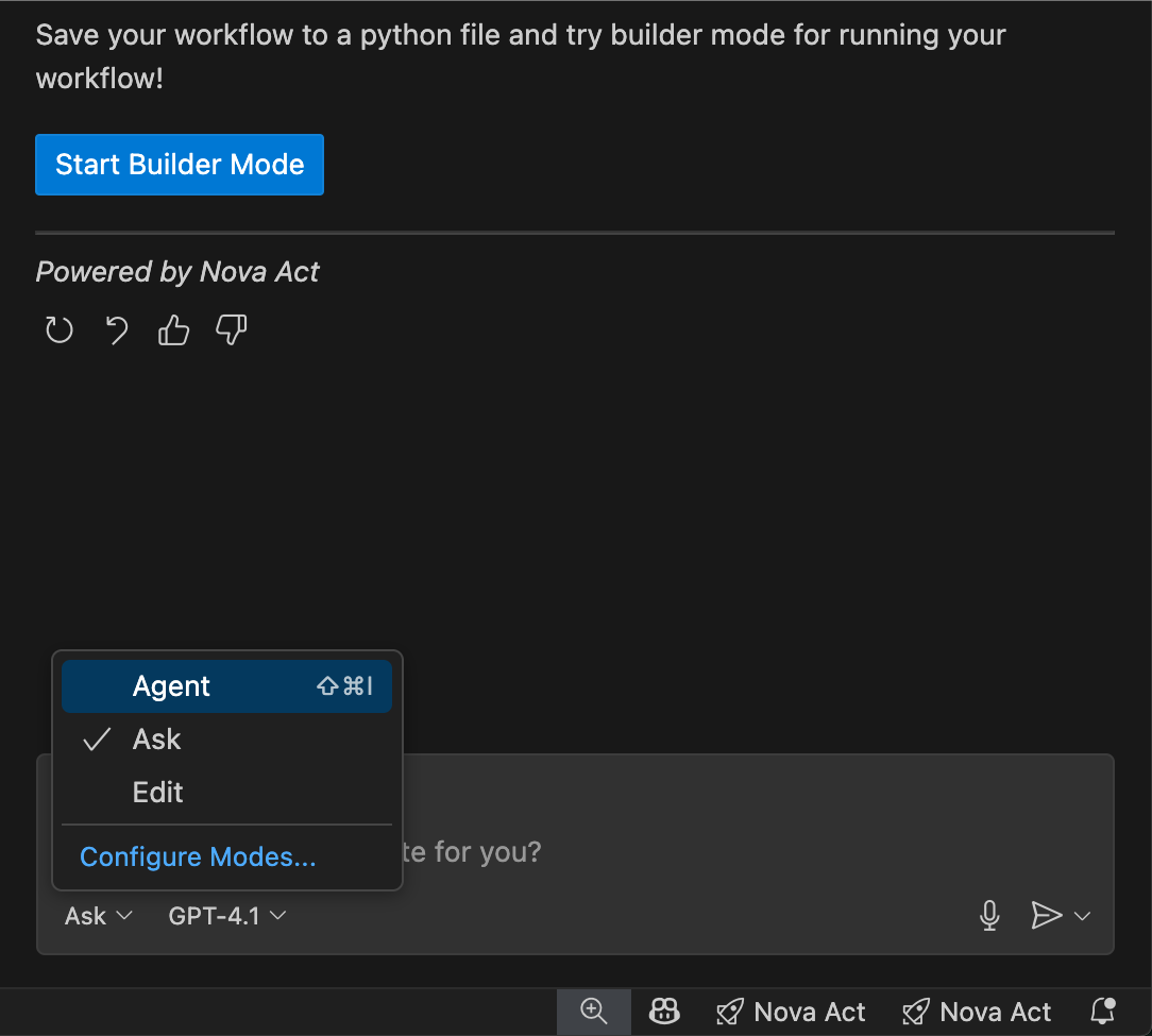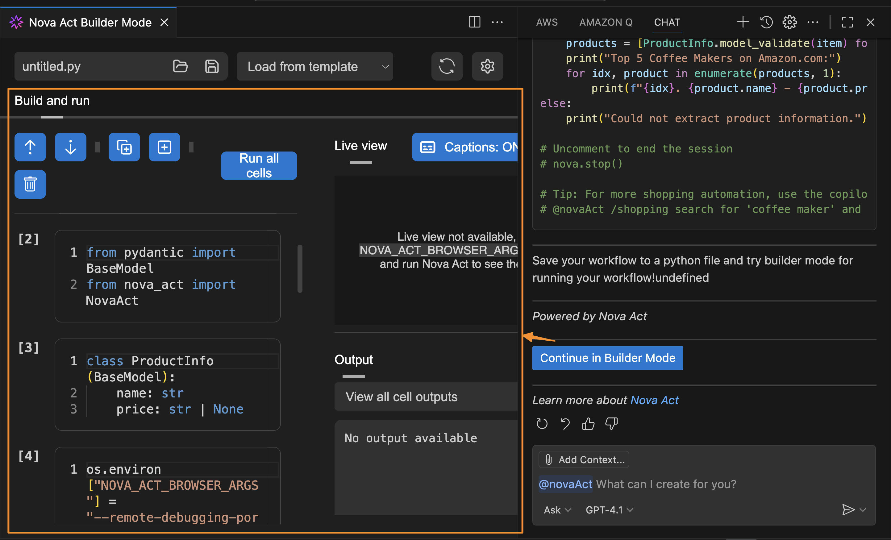 After I finish creating the script, I can choose Start Builder Mode, and the Nova Act extension will help me create a Python file in Builder Mode. This creates a seamless integration because I can switch between chat capability and Builder Mode.