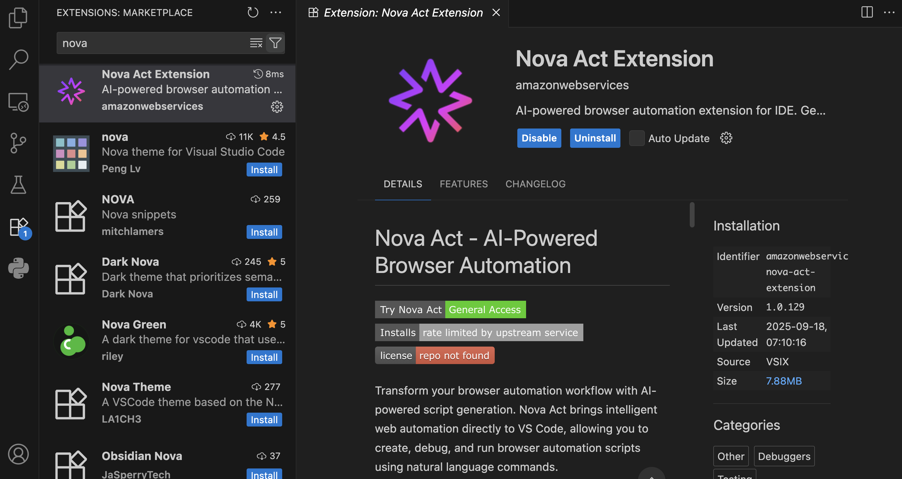 I’m using Visual Studio Code, and after choosing Extensions, I enter Nova Act. Then, I select the extension and choose Install.