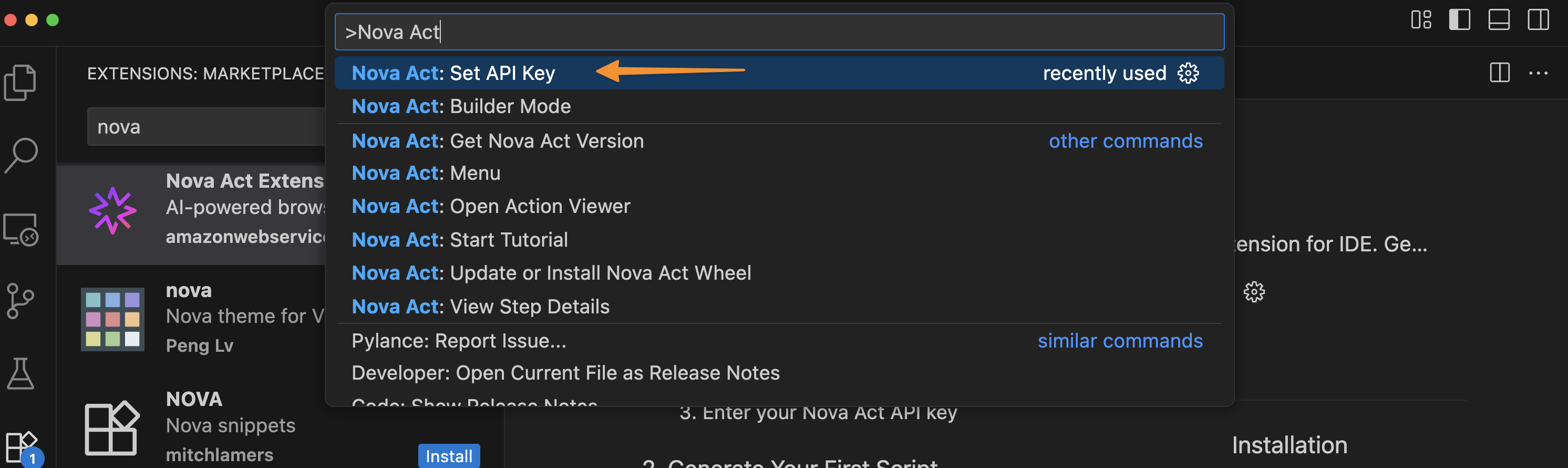 To get started, I need to obtain an API key. To do this, I navigate to the Nova Act page and follow the instructions to get the API key. I select Set API Key by opening the Command Palette with Cmd+Shift+P / Ctrl+Shift+P