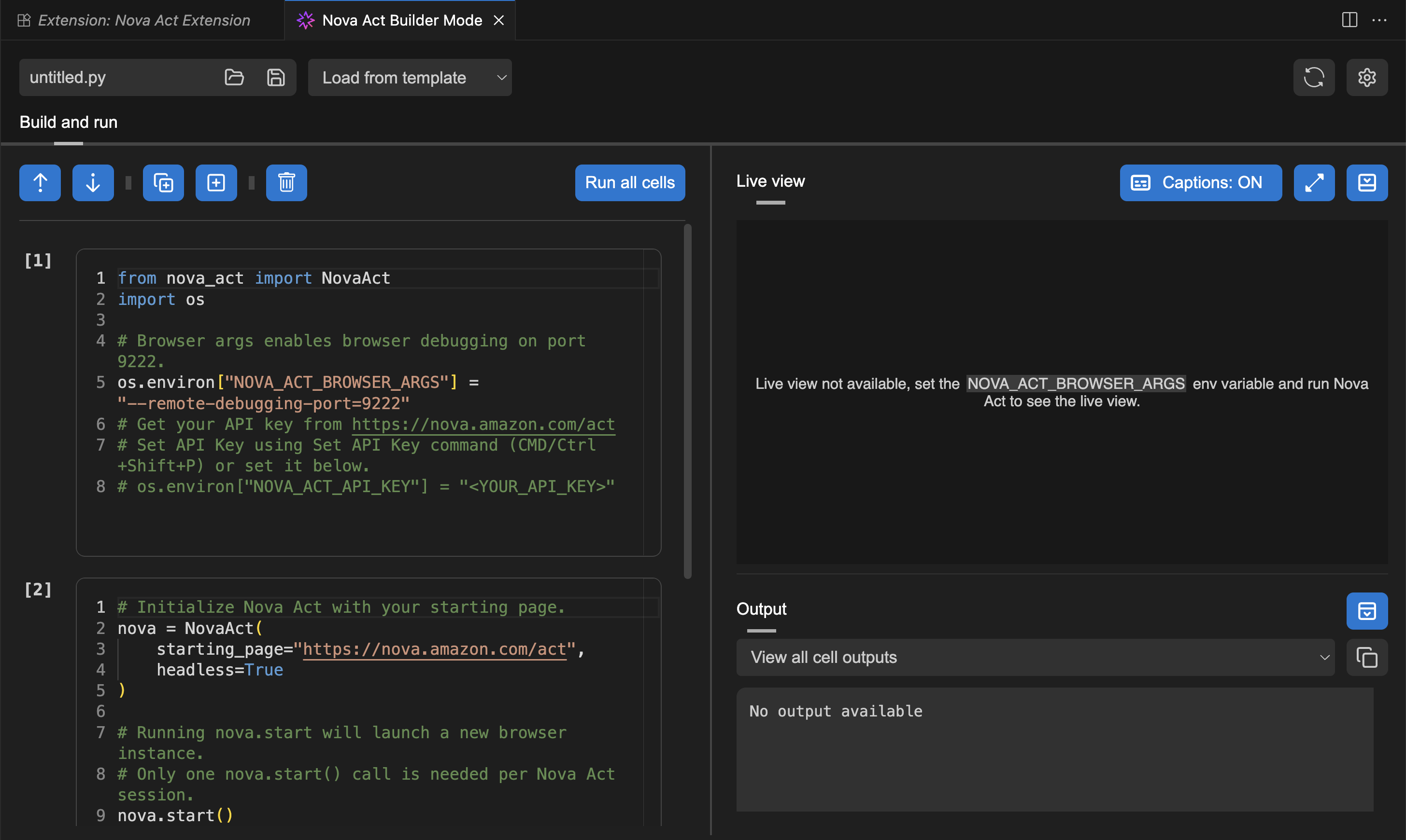 The Nova Act extension is built on top of the Amazon Nova Act SDK (preview), our browser automation agents SDK (Software Development Kit). The Nova Act extension transforms traditional workflow development by eliminating context switching between coding and testing environments. You can now build, customize, and test production-grade agent scripts—all within your IDE—using features like natural language based generation, atomic cell-style editing, and integrated browser testing. This unified experience accelerates development velocity for tasks like form filling, QA automation, search, and complex multi-step workflows.