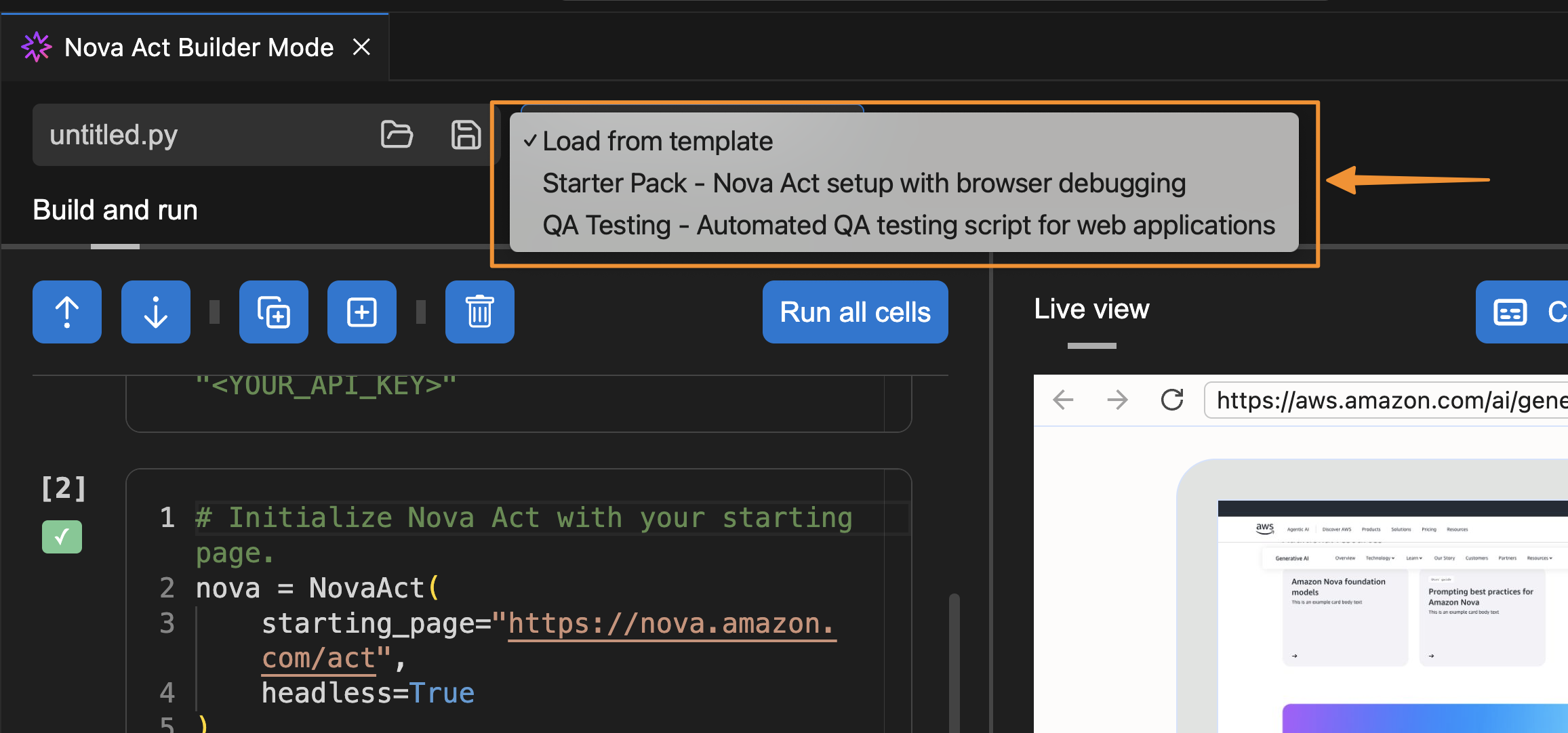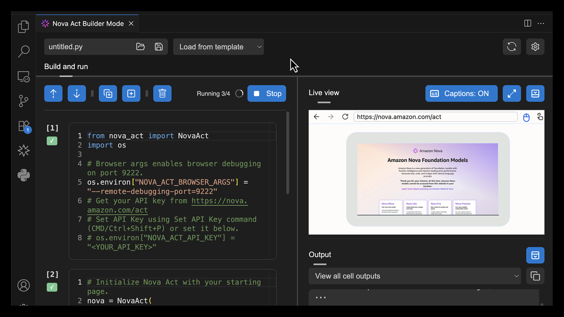 Here, I can use the Nova Act SDK to build my agent. On the right side, I have a Live view panel to preview my agent’s actions in the browser and an Output panel to monitor execution logs, including the model’s thinking and actions.