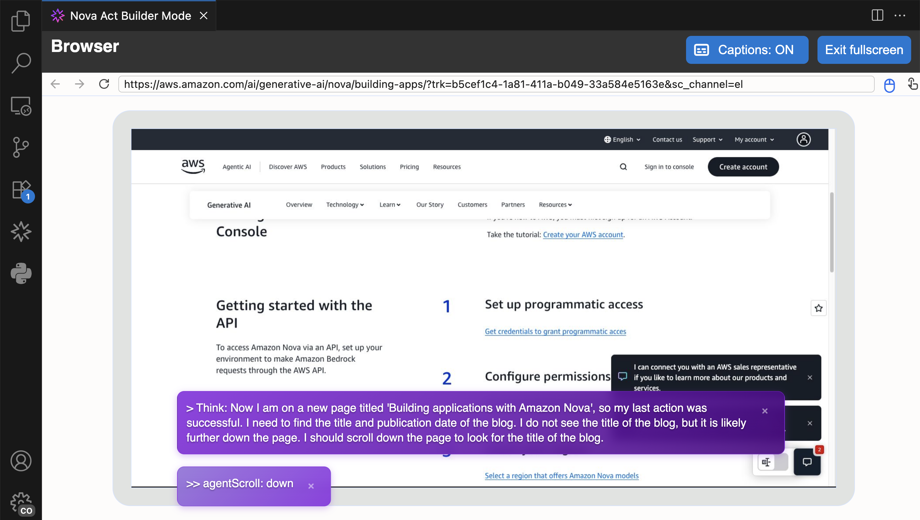Today, I’m excited to announce the Nova Act extension — a tool that streamlines the path to build browser automation agents without leaving your IDE. The Nova Act extension integrates directly into IDEs like Visual Studio Code (VS Code), Kiro, and Cursor, helping you to create web-based automation agents using natural language with the Nova Act model.