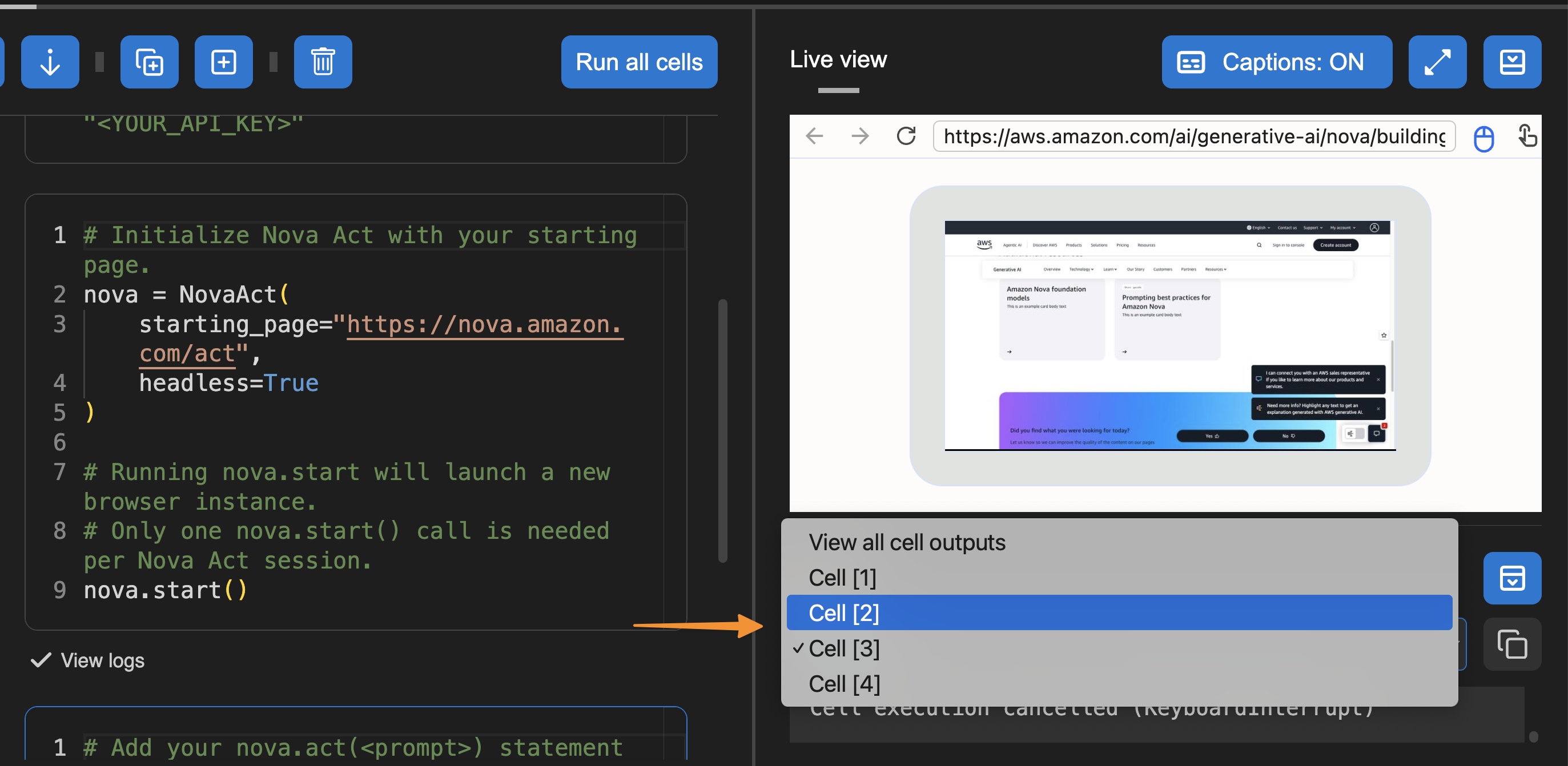 To test the Nova Act extension, I choose Run all cells. This will start a new browser instance and act based on the given prompt.
