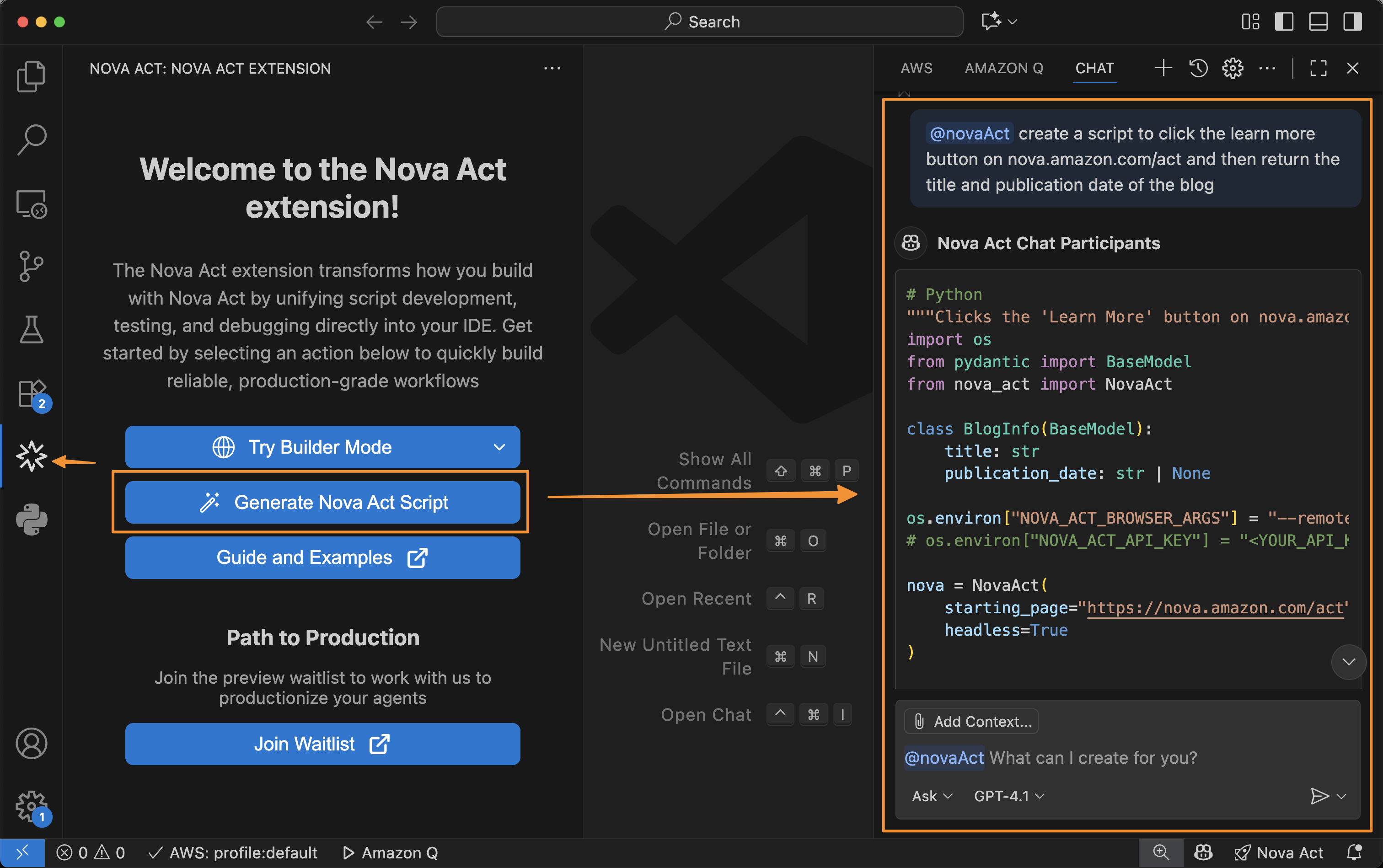 You can start with the Nova Act extension by describing your workflow in natural language to quickly generate an initial agent script. Customize it using the notebook-style builder mode to integrate APIs, data sources, and authentication, then validate it with local testing tools that simulate real-world conditions, including live step-by-step debugging of lengthy multi-step workflows.