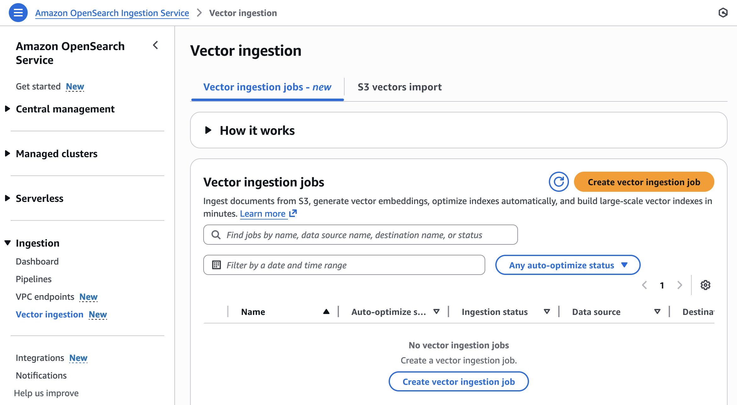To get started, choose Vector ingestion under the Ingestion menu in the left navigation pane of OpenSearch Service console.
