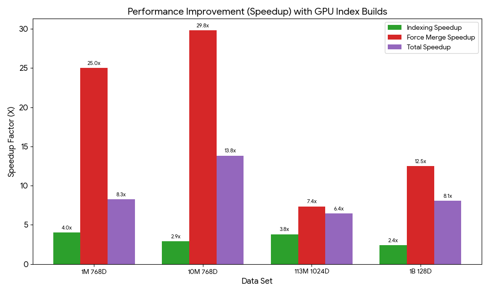 We ran index build benchmarks and observed speed gains from GPU acceleration ranging between 6.4 to 13.8 times. Stay tuned for more benchmarks and further details in upcoming posts.
