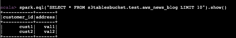 spark.sql("INSERT INTO s3tablesbucket.test.aws_news_blog VALUES ('cust1', 'val1')")