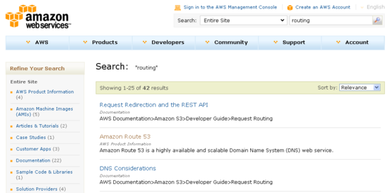 The portal’s brand-new search function is contextual and faceted. You can choose to search the entire AWS site or you can limit your search to just one area using the Search menu: