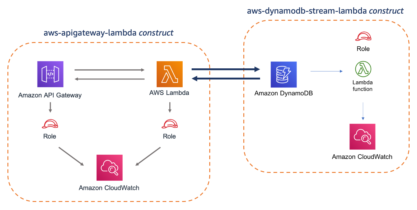 - aws-dynamodb-stream-lambda, a Construct implementing a DynamoDB table streaming data changes to a Lambda function with the least privileged permissions.