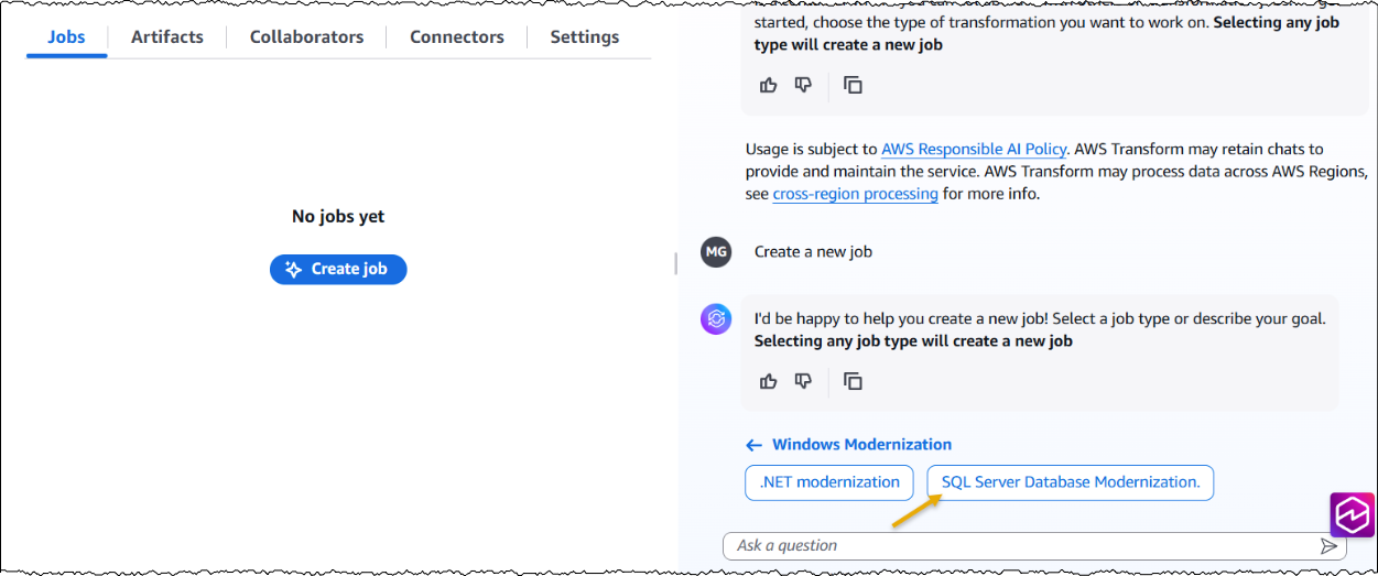 After creating the job, I complete the prerequisites. Then, I configure the database connector for AWS Transform to securely access SQL Server databases running on Amazon EC2 and Amazon Relational Database Service (Amazon RDS). The connector can connect to multiple databases within the same SQL Server instance.