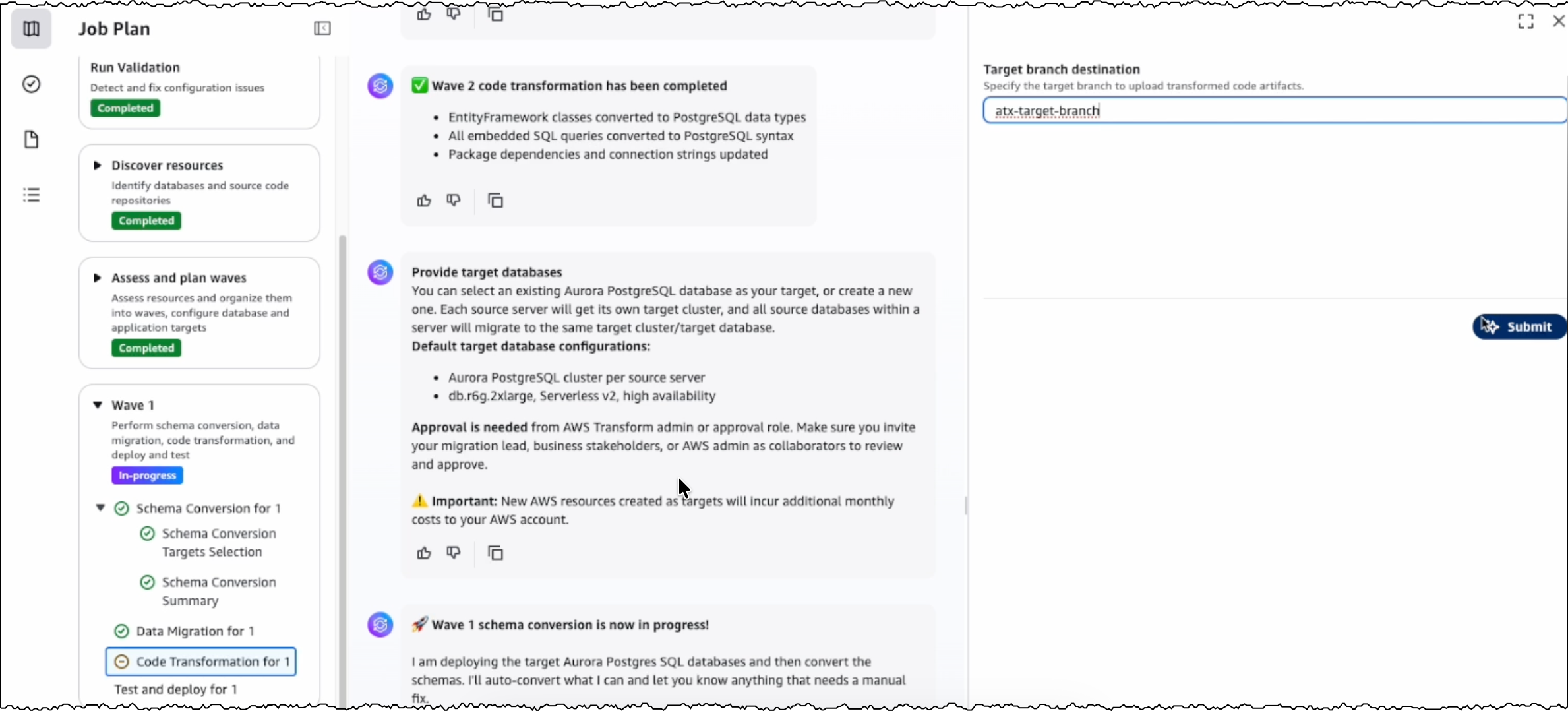 The next step is code transformation. I specify a target branch for AWS Transform to upload the transformed code artifacts. AWS Transform updates the codebase to make the application compatible with the converted PostgreSQL database.