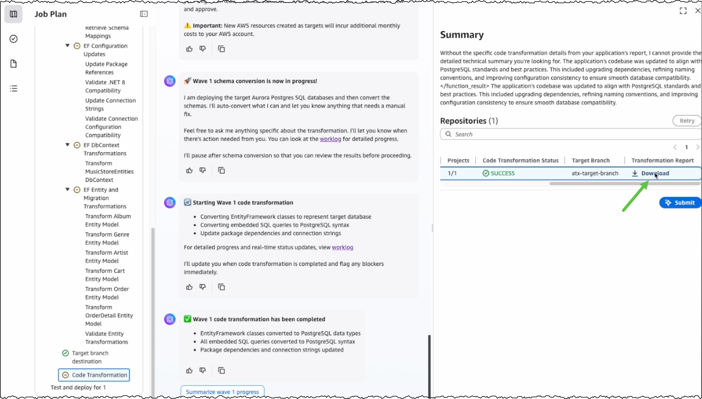 After the conversion is completed, I can view the source and target branches along with their code transformation status. I can also download and review the transformation report.
