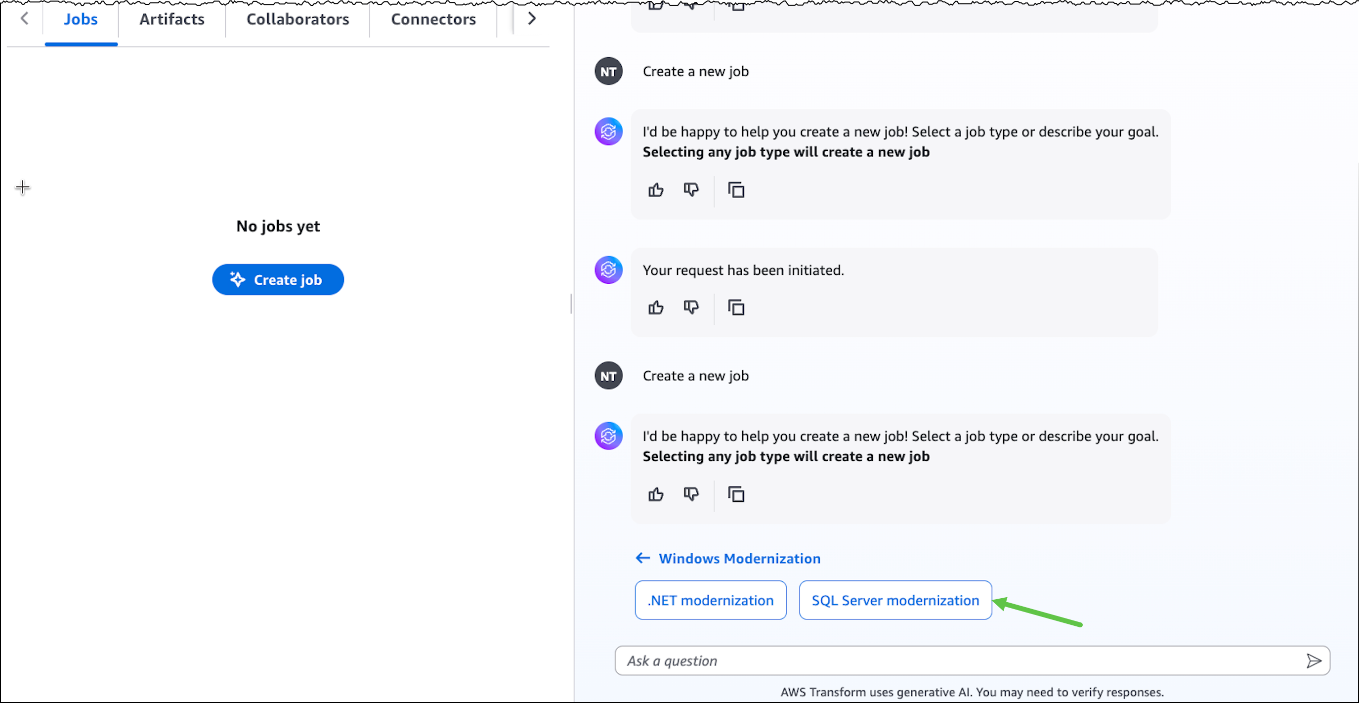 To get started with AWS Transform, I first complete the onboarding steps outlined in the getting started with AWS Transform user guide. After onboarding, I sign in to the AWS Transform console using my credentials and create a job for full-stack Windows modernization.