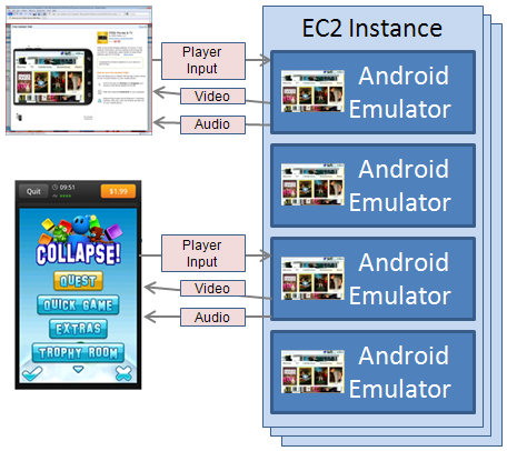 The app product page in the Amazon Appstore hosts a Player application. The Player application connects to an Amazon EC2 instance which runs multiple independent copies of an Android emulator. The emulator hosts and runs the Android application in a protected environment. The Player application has two primary responsibilities. First, it forwards player input to the Android application within the emulator. Second, it plays the audio and video streams produced by the Android application.