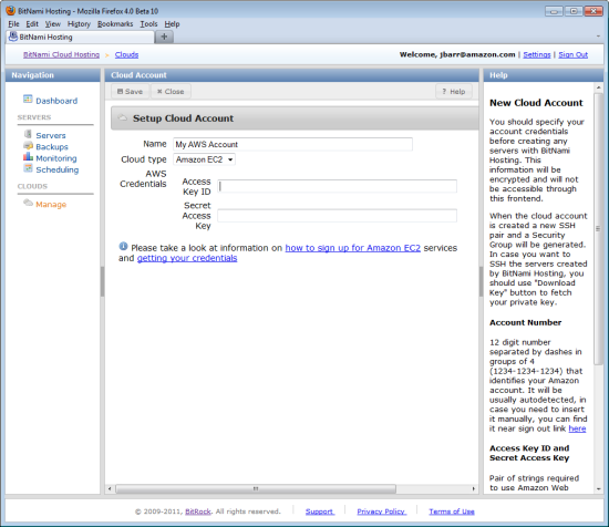 The first step is to create an account. You need to enter your AWS credentials here. Because this product is aimed at solution providers, you can even enter credentials for more than one AWS account. You could also enter AWS user credentials (created via AWS Identity and Access Management here if you’d like):