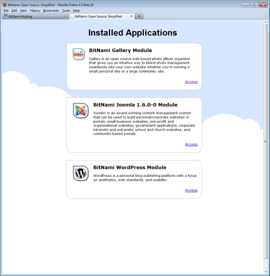 Each server that you launch via BitNami provides access to your applications using a customized entry portal