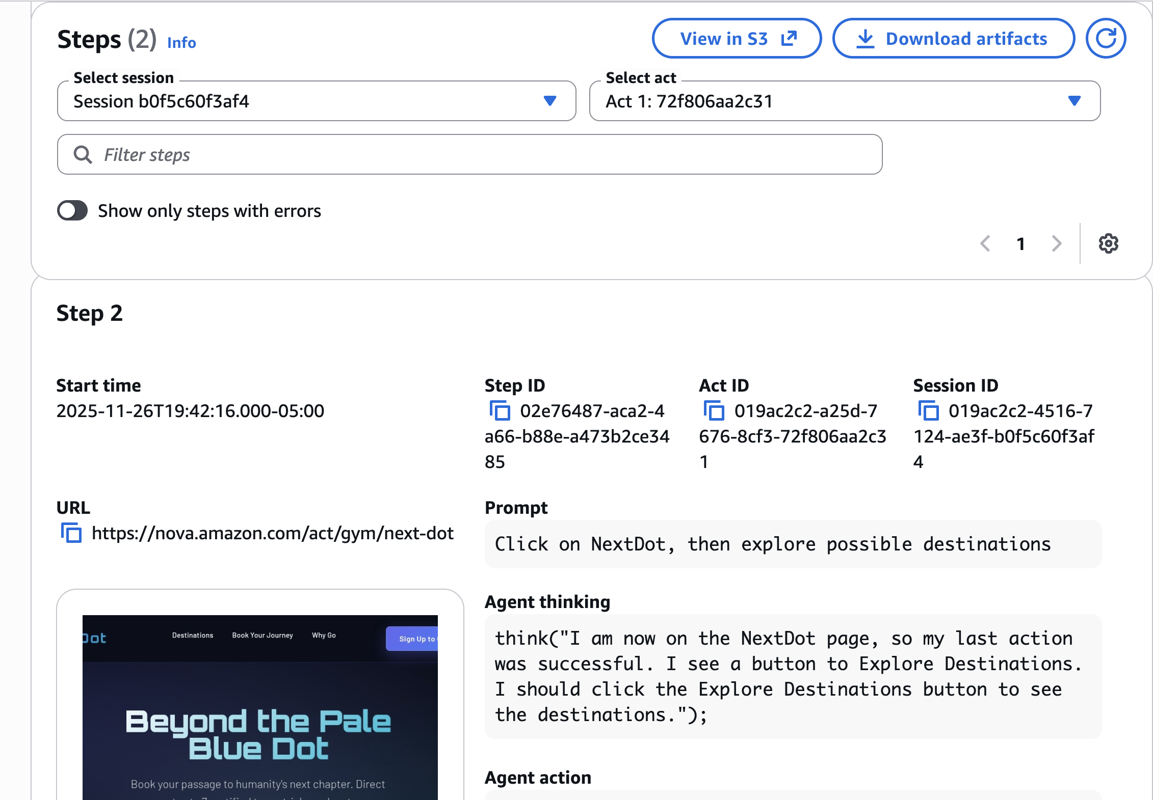 From here, we track the workflow progress and execution logs. Each step shows the agent’s reasoning, actions, and browser screenshots—the same level of visibility we had while developing in the IDE, now available for monitoring production executions at scale.