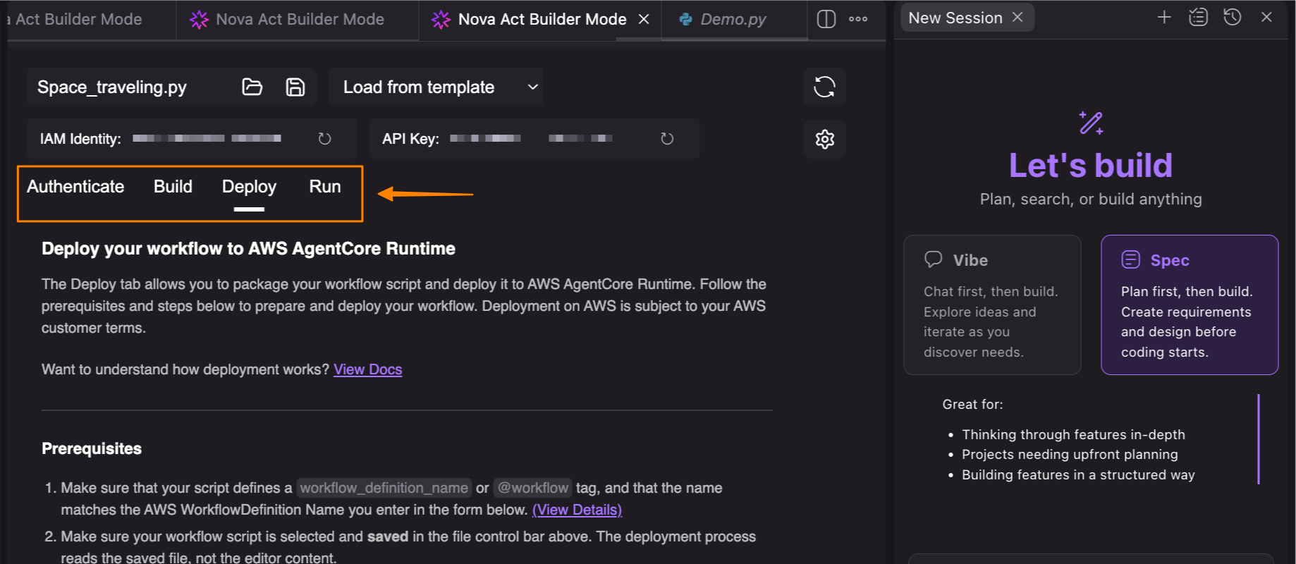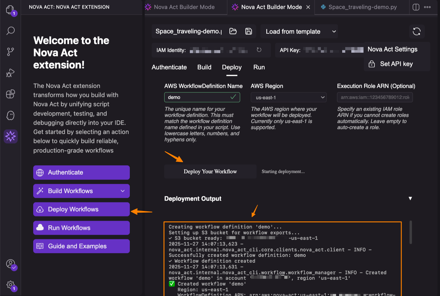 With this release, the Nova Act IDE extension introduces dedicated tabs for authentication, builder mode, deployment, and running workflows—bringing the complete development lifecycle into your IDE. While the extension provides the easiest path to production, developers can also use the Nova Act command line interface (CLI) or SDK directly for more advanced deployment configurations.