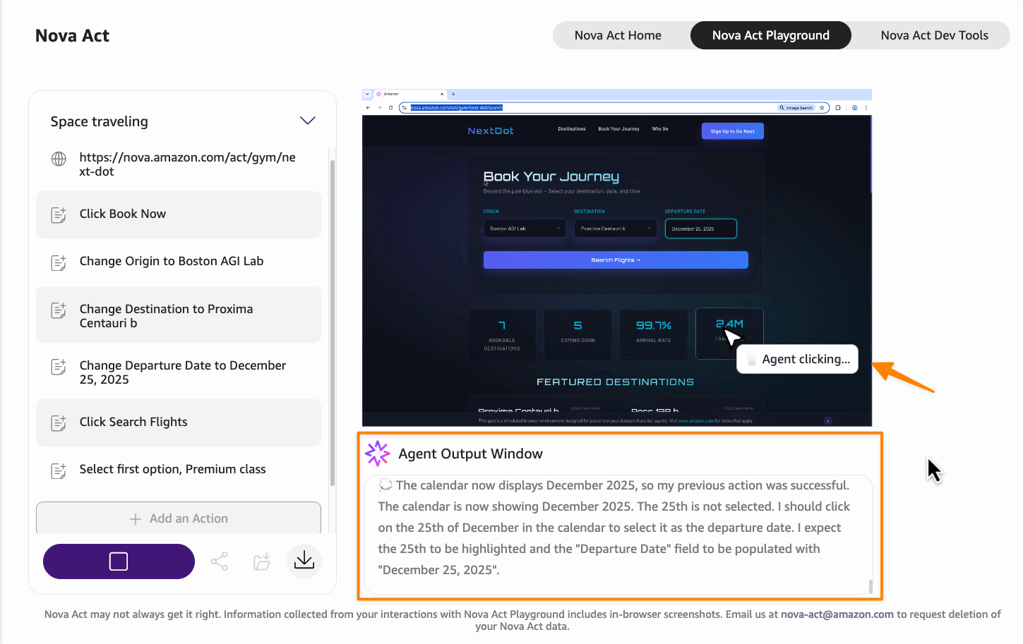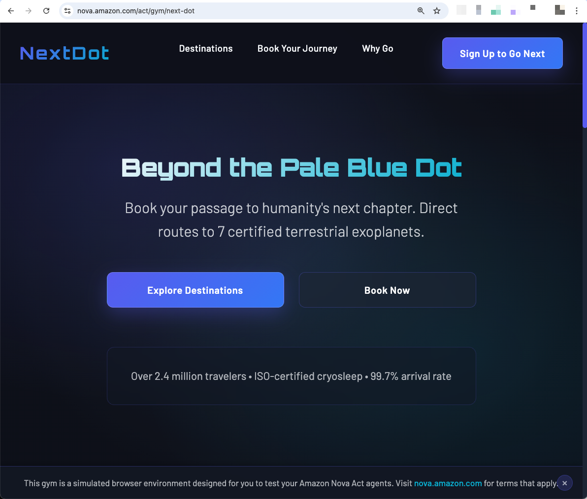 For these tests, we use Nova Act Gym, a simulated browser environment designed for testing Nova Act agents. We’re using a fictional travel booking website to terrestrial exoplanets.