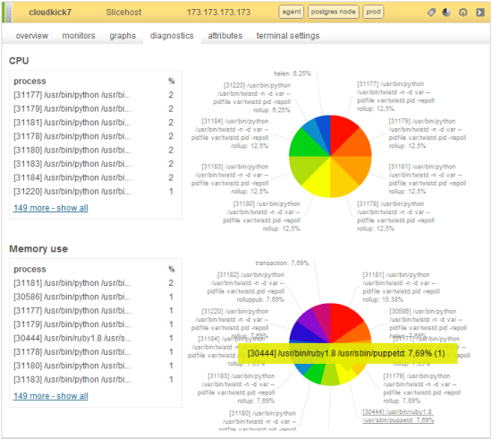 Instances can be tagged, and the tags can be used to perform collective actions. Using a small, low-overhead agent installed on each instance, Cloudkick monitors CPU load, network bandwidth, and memory usage. The data collected by the agents can be graphed, with optional grouping by tag.
