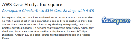 foursquare (new AWS case study) is a location-based social network. Over 10 million foursquare users check in via a smartphone app or SMS to exchange travel tips and to share their location with friends. By checking in frequently, users earn points and virtual badges. To perform analytics across more than 5 million daily check-ins, foursquare uses Amazon Elastic MapReduce, Amazon EC2 Spot Instances, Amazon S3, and open-source technologies MongoDB and Apache Flume. By taking advantage of new Amazon EC2 price reductions and using a combination of On-Demand and Reserved Instances, foursquare saves 53% in costs over self-hosting while maintaining their scalability needs.