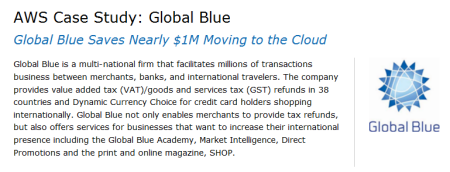 Global Blue (new AWS case study) is a multi-national firm that has been instrumental in delivering tax-free shopping and refund points to international travelers for nearly 30 years. The company’s network has helped 270,000 retailers, shopping brands, and hotels in 40 countries. In 2010, Global Blue handled over 20 million transactions worldwide and an estimated 55,000 travelers use their services everyday. To help track the transactions occurring between merchants, banks, and international travelers, the company needed to create more capacity for their business intelligence (BI) needs. As a result of moving to AWS, Global Blue has increased speed, capacity, and scalability all while avoiding $800,000 in CapEx and $78,000 in OpEx costs that would have been spent self-hosting. That’s nearly $1M in cost savings by moving to the cloud!