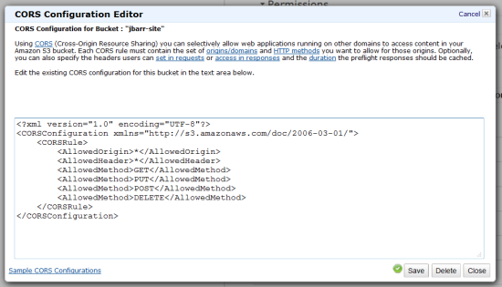 If you plan to use the S3 APIs you will first need to enable CORS (Cross-Origin Resource Sharing) on the target buckets. Using the AWS Management Console, create or open a bucket, click on Properties, and Edit CORS Configuration. The sample configuration in the box below will allow your application to perform GET, PUT, POST, and DELETE operations on the objects in the bucket: