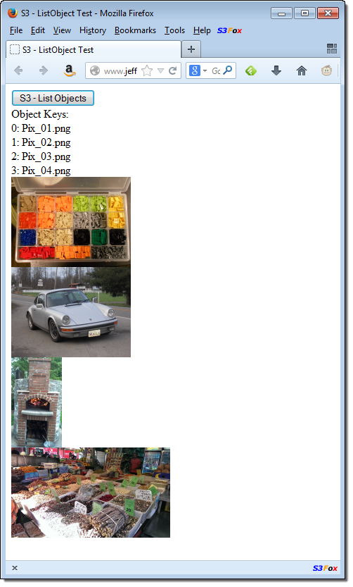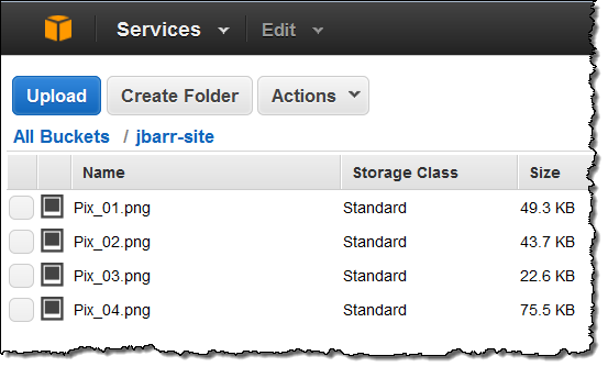 As you can see, you could create a very simple photo album with a very modest amount of code. Since there’s no server-side code at all, you don’t even need a web server to host your application. Deploying your web application can be as simple as uploading it to your S3 bucket with public-read permissions. Think about the implications of this architecture, and let me know what you come up with!