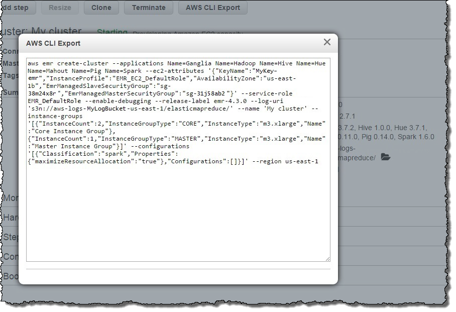 You can now generate an EMR create-cluster command representative of an existing cluster with a 4.x release using the AWS CLI Export option on the Cluster Details page in the AWS Management Console. This allows you to quickly create a cluster using the Create Cluster experience in the console, and easily generate the AWS CLI script to recreate that cluster from the AWS CLI.