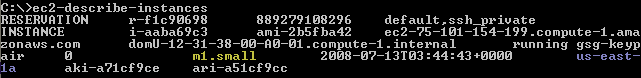 If you already have an On-Demand instance running and you want to convert it to a Reserved Instance, or if you have an EBS volume in a particular Availability Zone, then your choice is clear. You can use the ec2-describe-instances command to figure out the availability zone and instance type if necessary. In the screen shot below, I have highlighted the instance type in yellow and the availability zone in purple to make it clear where to find them: