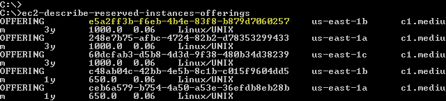 The next step is to run ec2-describe-reserved-instances-offerings and select the appropriate offering. Each offering is identified by an alphanumeric id such as e5a2ff3b-f6eb-4b4e-83f8-b879d7060257 (highlighted in yellow below):