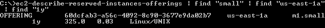 You can also get fancy and run a search pipeline. Here’s how I found an m1.small instance in us-east-1a with a 1 year term: