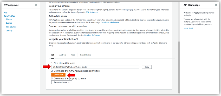 After the TaraTestApp API has been created and the associated AWS resources provisioned on my behalf, I can make updates to the schema, data source, or connect my data source(s) to a resolver. I also can integrate my GraphQL API into an iOS, Android, Web, or React Native application by cloning the sample repo from GitHub and downloading the accompanying GraphQL schema. These application samples are great to help get you started and they are pre-configured to function in offline scenarios.