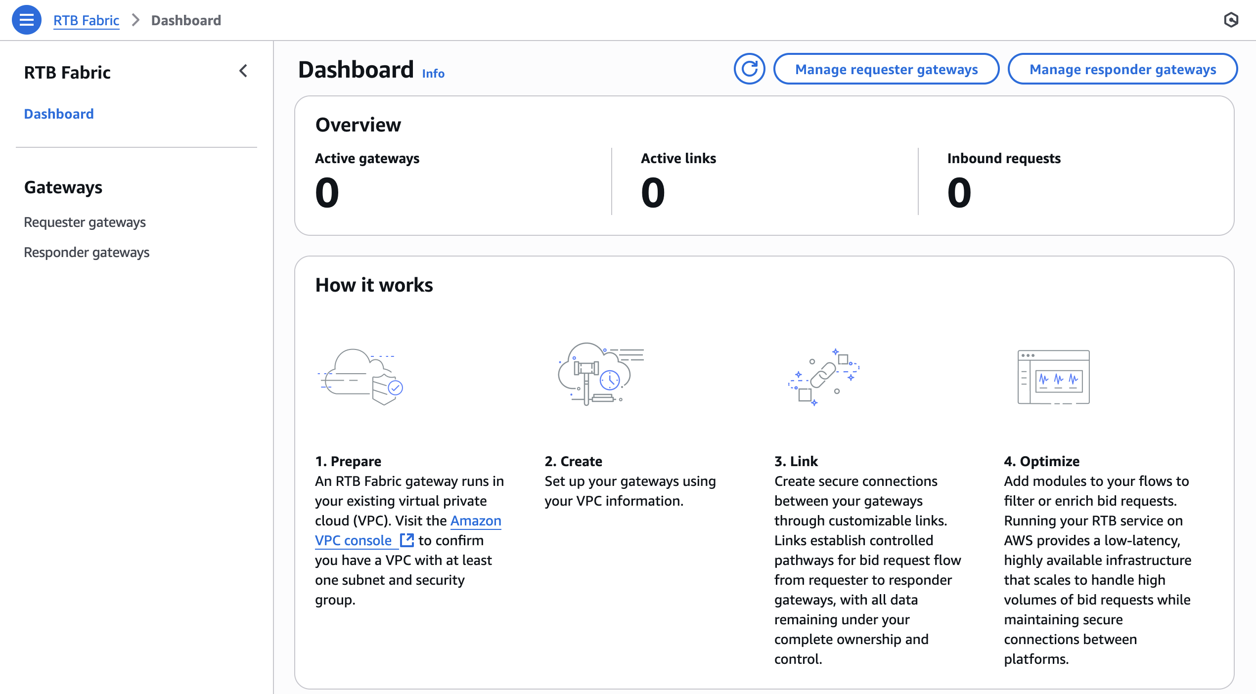 The console provides a visual entry point to view and manage RTB gateways and links, as shown on the Dashboard of the AWS RTB Fabric console.