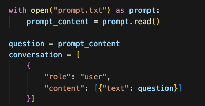 Because the prompt is quite long I put it in a text file locally and just load it up in code. I then set up the Amazon Bedrock converse payload setting the role to “user” to indicate that this is a message by the user of the application and add the prompt to the content.