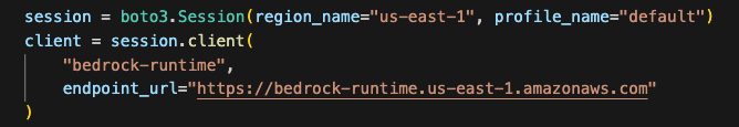 Following best practices, I create a boto3 session and create an Amazon Bedrock client from it instead of creating one directly. This gives you explicit control over configuration, improves thread safety, and makes your code more predictable and testable compared to relying on the default session.