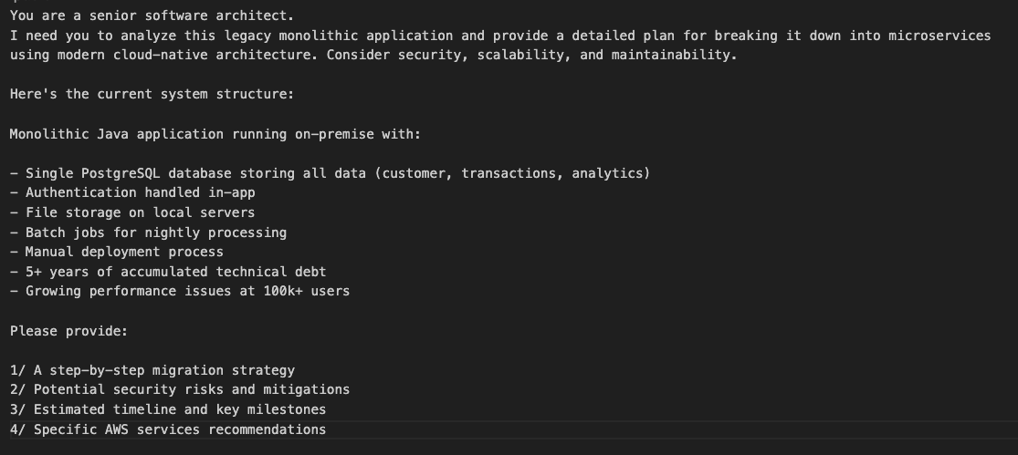 I want to give the model something with a bit of complexity instead of asking a simple question to demonstrate the power of Sonnet 4.5. So I’m going to give the model the current state of an imaginary legacy monolithic application written in Java with a single database and ask for a digital transformation plan which includes a migration strategy, risk assessment, estimated timeline and key milestones and specific AWS services recommendations.