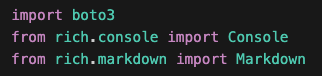Let’s see this in action with a simple example. I’m going to use the Amazon Bedrock Converse API to send a prompt to Sonnet 4.5. I start by importing the modules I’m going to use. For this short example, I only need AWS SDK for Python (Boto3) so I can create a BedrockRuntimeClient. I’m also importing the rich package so I can format my output nicely later on.